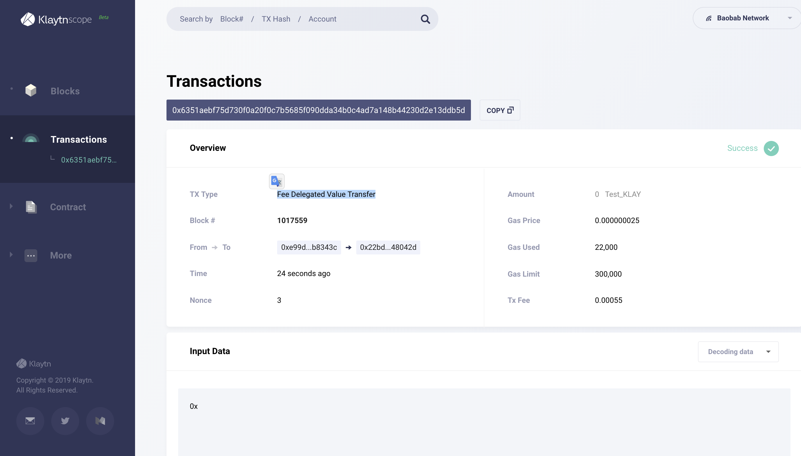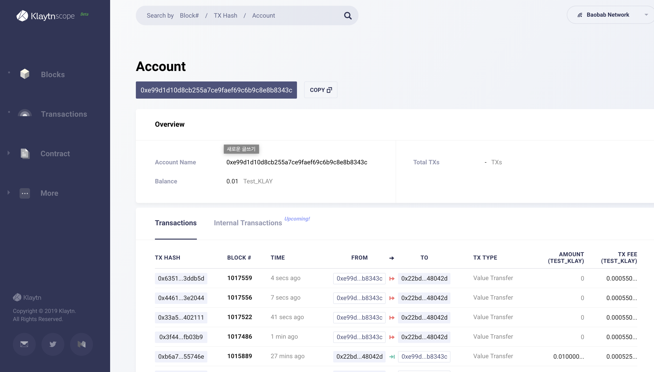 Transaction을 조회하면 Tx Type이 Fee Delegated Value 로 되어있다. 일반 계좌 조회로 보면 Value Transfer / Transaction 조회로 보면 Fee Delegated 로 조회 된다. Klaytn Scope의 의도인지는 잘 모르겠다. 예제를 통해 정리된 것