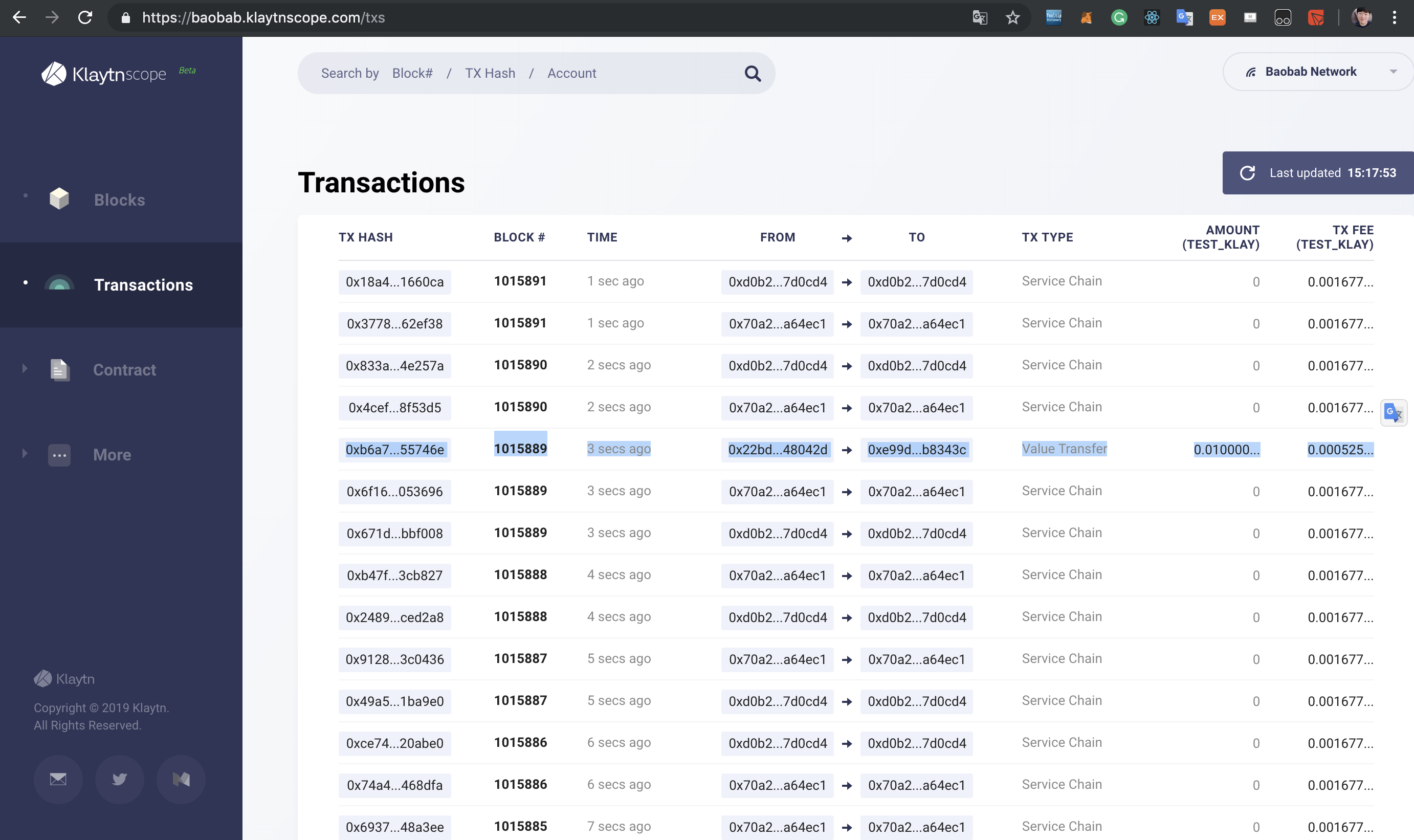 // Normal Transfer transfer = async () => { const userPrivateKey = '0xb83edaf89879b3c615bb6019af65313984812aa94dce7ca5b5d8abef899c1141'; const userAddress = '0x22Bd0365568F9266810A69a2b90f36064148042D' // (1) Add User Private Key cav.klay.accounts.wallet.add(userPrivateKey) // (2) Create Transaction const transaction = { type: 'VALUE_TRANSFER', from: userAddress, to: '0xe99D1d10d8CB255a7ce9fAeF69c6B9C8e8b8343C', gas: '300000', value: cav.utils.toPeb('0.01', 'KLAY'), } // (3) Send Transaction cav.klay.sendTransaction(transaction) .on('transactionHash', console.log) .on('receipt', async (receipt) => { const newAccountBalance = await cav.klay.getBalance(userAddress) console.log(newAccountBalance); }) .on('error', console.log) }위의 코드는 정상적인 User 송금이다. 실행하게 되면 Klaytn Scope에 해당 Transaction이 성사된 모습을 볼 수 있다.