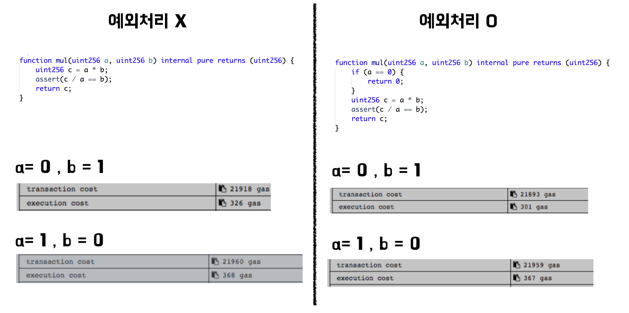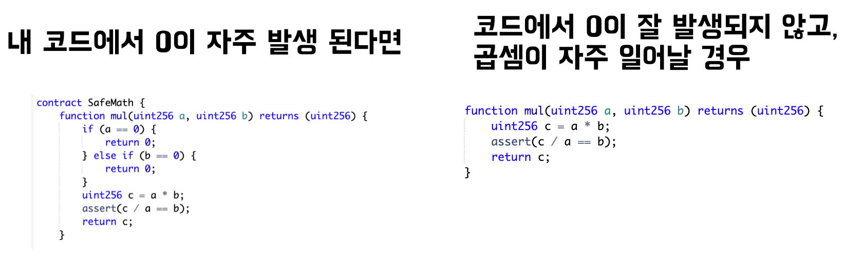 SafeMath library Multiplication 위의 상황은 SafeMath 라는 library 이다. 왼쪽 기존 SafeMath에서는 a == 0 일때라는 조건 검사를 넣지 않았다.