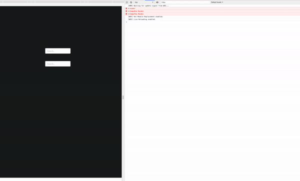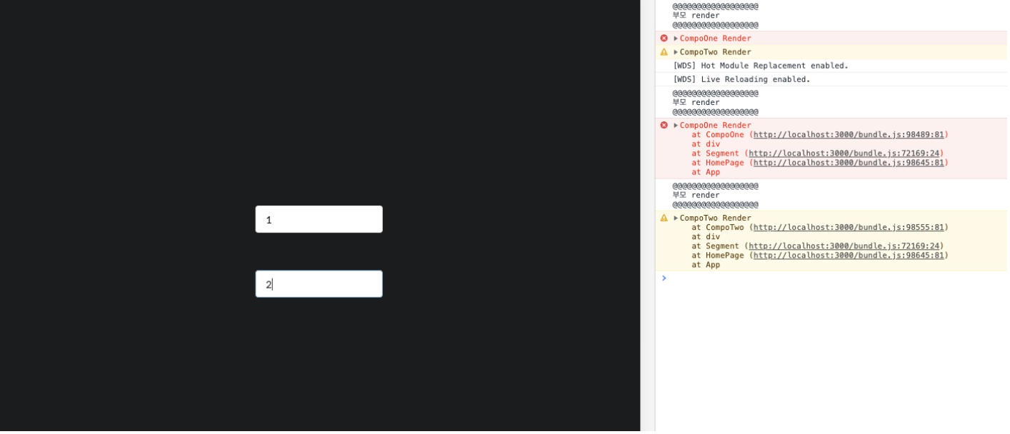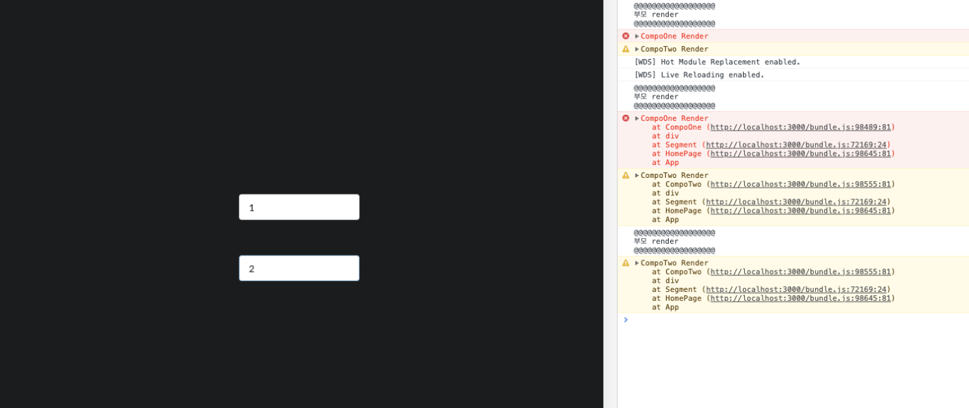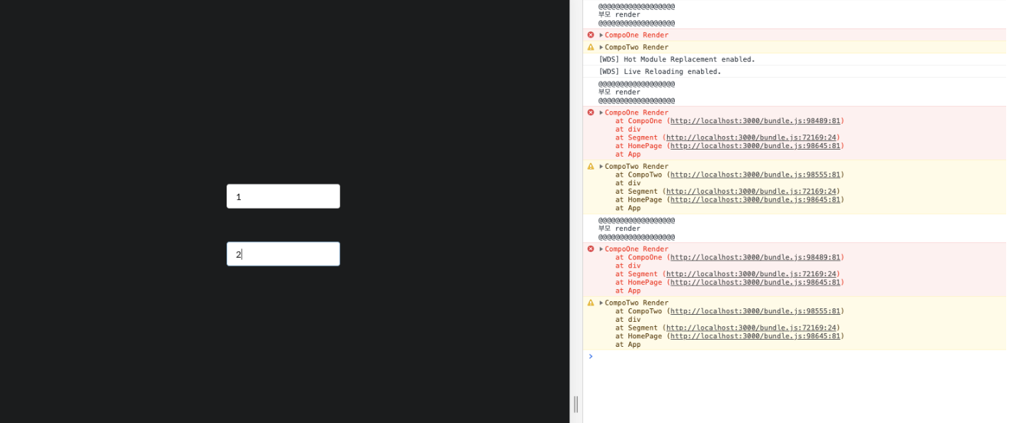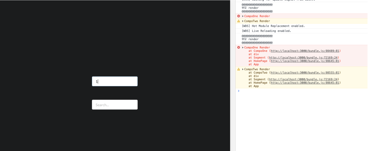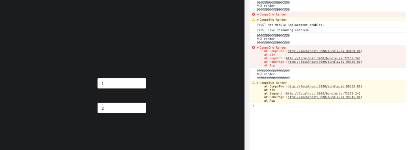 정신 없어 보이지만, 자식1 을 고쳐도 부모, 자식2 가 함께 Re-render 되는 모습이다. (console.error가 3개씩) 위의 gif 처럼 자식2 (두 번째 Input창)의 값이 변경 되지 않아도, 자식1의 변경으로 인하여 Re-render되는 형상이 가볍게만 느껴지지 않는다. 혹여 render하면서 반응형을 체크 하거나, 또 그 하위 자식들이 많을 경우 이는 분명 성능 문제를 일으킬 것이다.
