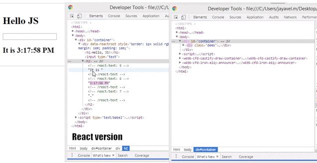 https://stackoverflow.com/questions/52551853/what-is-the-real-world-example-of-real-dom-and-virtual-dom-in-react DOM을 사용하는 JS Version 에서는 하나의 컴포넌트가 바뀌는데 변하지 않는 요소까지 모두 바뀌는 모습을 볼 수 있다. 그 외, DOM API가 확장 되면서 문제가 많이 발생했다고 한다. (2010년도 부터 꾸준히 관련 이슈들 글이 많다. 이 글에서는 여기까지 다루지 않을 예정이다.)