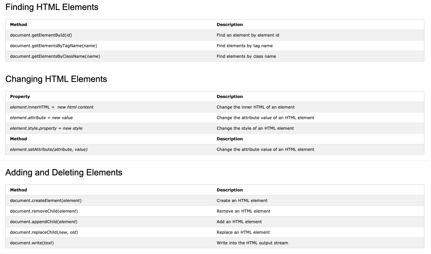 출처: https://www.w3schools.com/js/js_htmldom_document.asp 사진 이외에도 많은 리스트 들이 있지만, 가장 큰 기능은 아래 3가지라고 생각 한다.