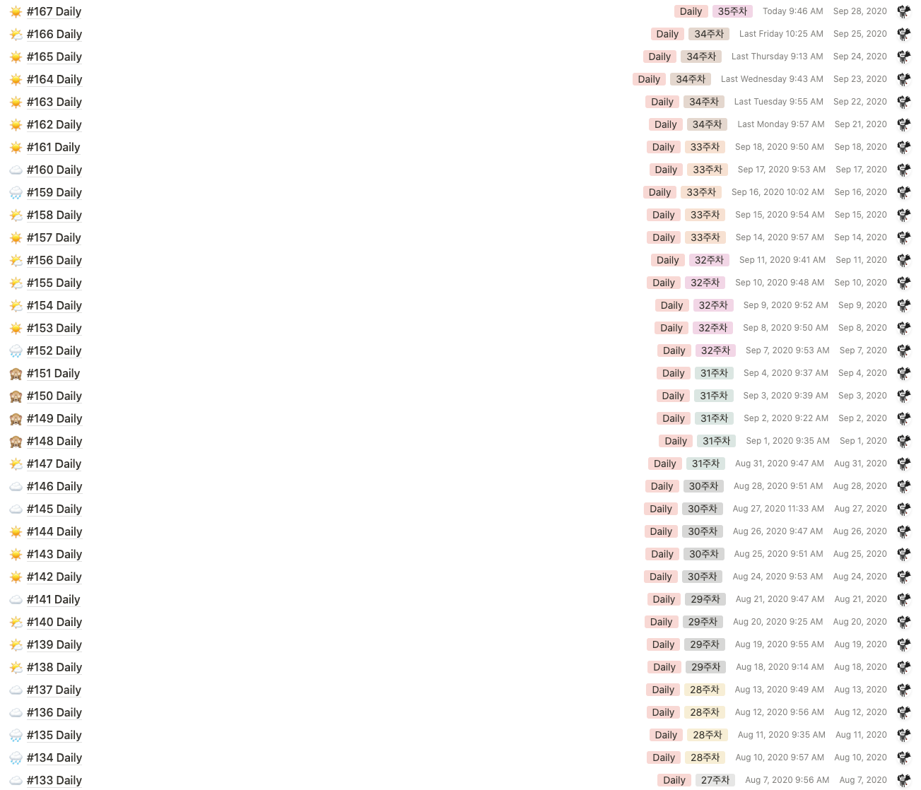 날씨를 표기하기 위해, 출근시 항상 하늘을 보게 되었던 것 같다. 이 점이 무엇보다 기억에 남는다. Daily를 다시 열어볼 일은 흔치 않지만, 개인적으로 부끄럽지 않는 날이 되기 위해 하루하루 최선을 다했다고 생각한다.