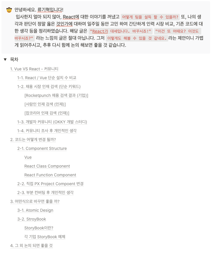 입사를 하고, 첫 째날은 여러 서류들을 제출하며 상황 파악을 했다. `어떤 방식으로 개발이 진행되었고, 나의 역할이 무엇인지.` 하지만 대격변의 시기였기 때문에 명확한 것은 아무것도 없었다. 한 가지 확실한 것은 어떤 프로젝트를 진행 하던 기존의 프레임워크는 Vue였고, 내가 경험한 것은 React였다. 반 년이 지난 이후에도 난 Vue <-> React 의 장벽이 높지 않다고 생각 하지만, 난 조언을 구할 팀내 개발자가 없는 상태였기에 입사 둘 째날 부터 Vue와 React를 비교하였고, 프레임워크를 변경하고 싶다고 이야기를 했다.
