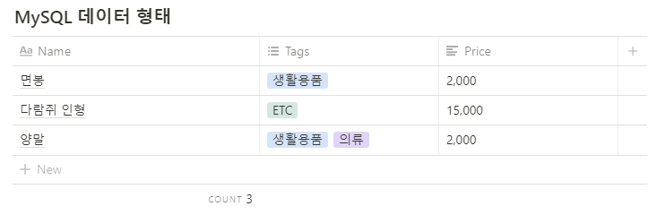{ Name : "면봉", Tags : ["생활용품"], Price : 2000 } { Name : "다람쥐 인형", Tags : ["ETC"], Price : 15000 } { Name : "양말", Tags : ["생활용품", "의류"], Price : 2000 }내 생각
