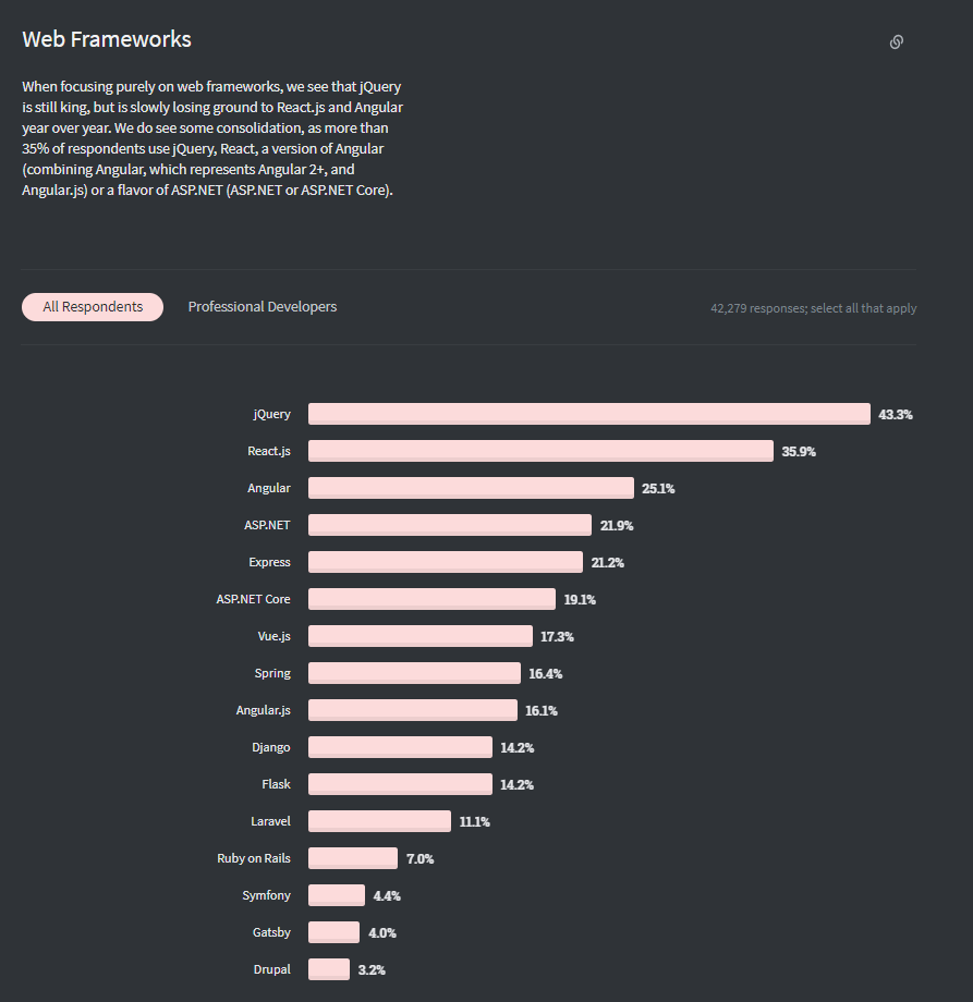 백엔드의 주요 업무가 진행 되는 WAS의 기술 스텍은 어떻게 될까? 아래 스택오버플로우의 2020년 설문을 보면 프론트, 백엔드에 관계 없이 Web Frameworks 카테고리에 나타나있다. 참고해보자.