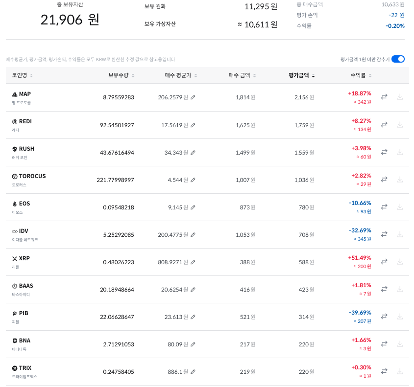 아래 스크린샷은 행님덜이 절 추천해주시고 신나게 매수하고 있으신 코인 목록입니다.